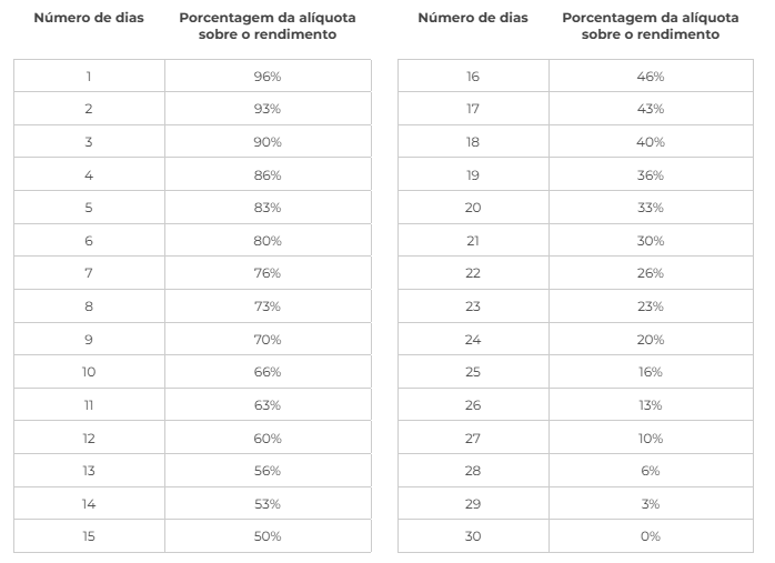 Outras taxas previstas é cobrado caso ocorra o saque de um aporte antes de completar 30 dias de aplicação. Essa taxa cobre custos operacionais de tesouraria para a instituição e é regressiva. Veja: