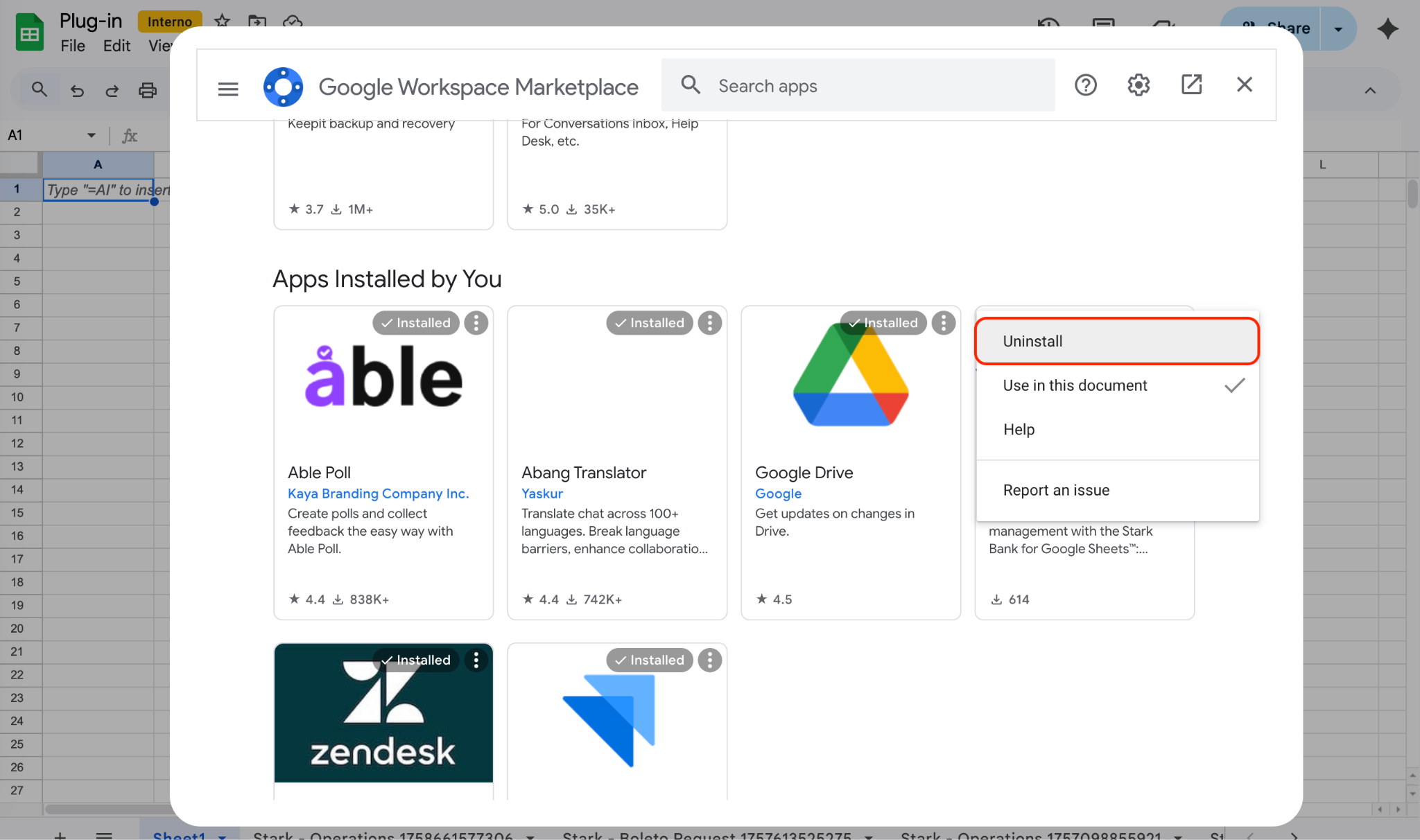 3. Ao localizar a extensão do Stark Bank, clique em Opções e escolha Desinstalar: